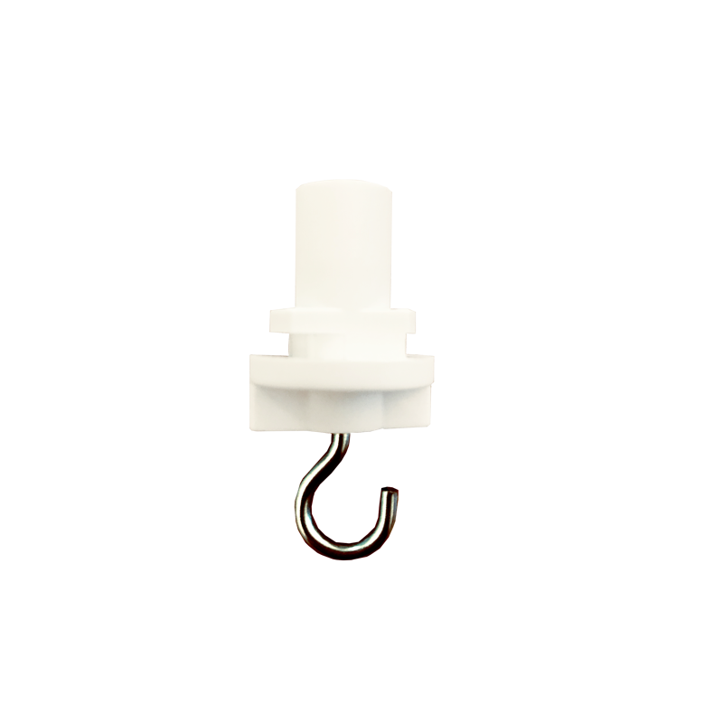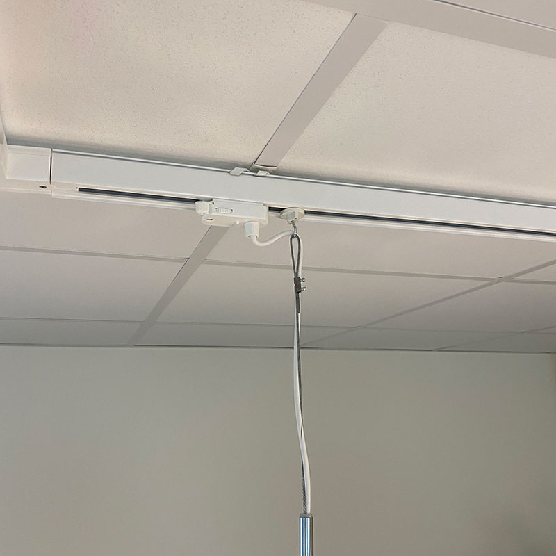 Krokfäste med krok som kan fästas i en monterad trefas skena. Används för att hänga saker i skenan och slippa montera krokar i taket.