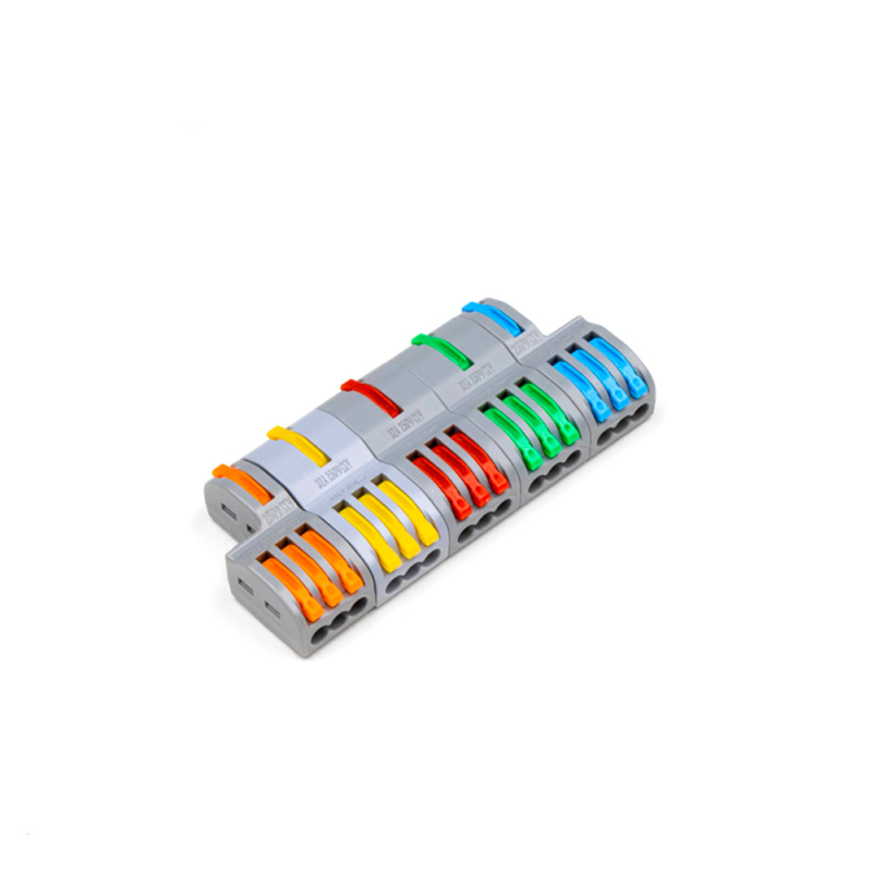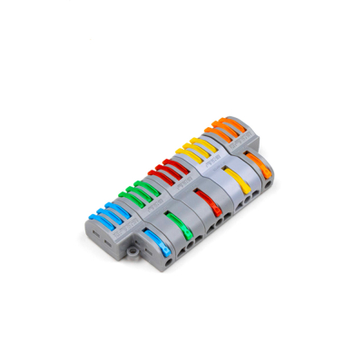 Kopplingsplint för att koppla samman flera RGBW ledstrips till samma utgång. Uttag för Plus, Vitt, Röd, Grönt och Blått.