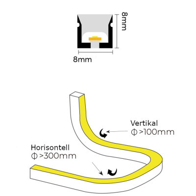 Denna tunna led-neonslang kan monteras med clips eller monteringsskena. Den passar också bra att fräsa in i trä. Neon-slangarna har ingen dubbelhäftande tejp på baksidan.
