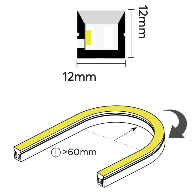 Flexibel LED-slang som är böjbar horisontellt. Storleken är 12x12mm. Ljusfärg RGB. Passar när man vill ha böjbara ledlister som skall gå runt runda hörn eller man vill skapa s-former.