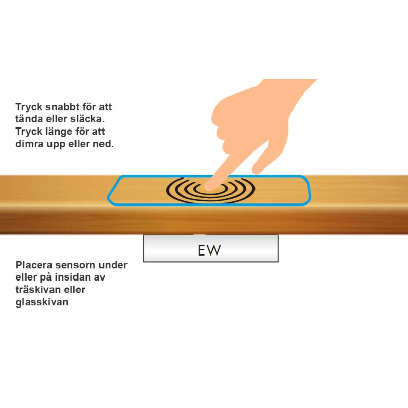 Montera sensorn på insidan av till exempel en skåpsida. Tryck sedan på skåpsidan för att tända och släcka ljuset alternativt håll för att dimra upp eller ner.