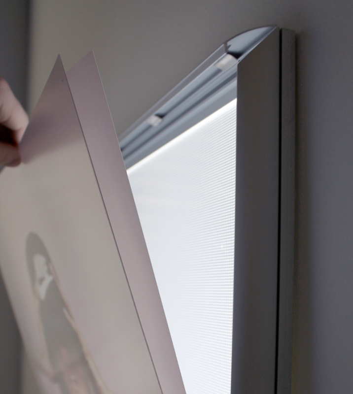 Budskap byts enkelt via snäppram som viks upp förhand. Inga verktyg behövs. Ramen är 25mm bred. Ljustavlan levereras komplett med upphängningsclips för vägg och transformator med 3,5m anslutningssladd. Bara att placera affischen i tavlan och koppla in strömmen. Affischen skall tryckas på ljuslådefilm eller backlit-film för bästa resultat.