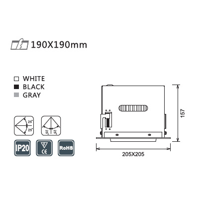 Montering | Infällt i innertak. Håltagning 190x190mm. Fjädrar håller fast downlighten i hålet. |