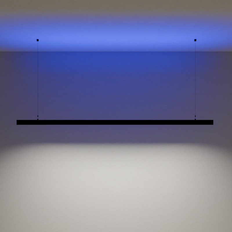 Topup med RGB ljus uppåt och vanligt vitt ljus nedåt. Ljusfärgen uppåt och dimring nedåt styrs helt separat via Casambi-appen eller via fjärrkontroll på väggen.