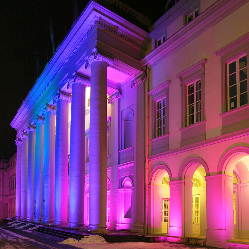 RGBW strålkastare med smal spridningsvinkel som fungerar både utomhus och inomhus för att lysa upp väggar, pelare, fasader och träd med färgat ljus. Ljusfärgen styrs antingen via Zigbee som finns inbyggt i strålkastare eller via en fjärrkontroll som köps till som tillbehör. En fjärrkontroll kan styra flera strålkastare